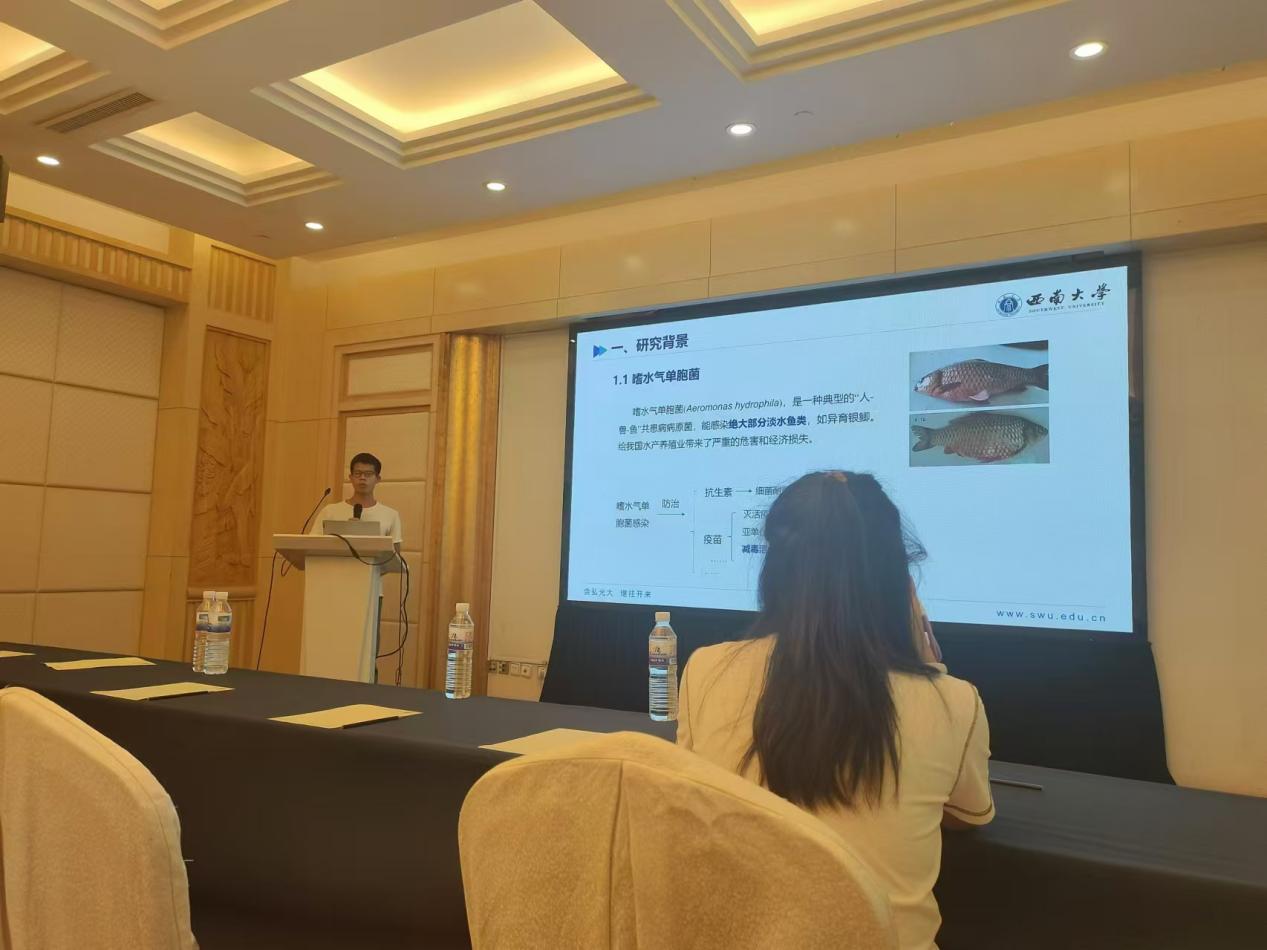 公司三名教师(吴荣华、何远法、朱松)和三名员工参加此次盛会。会议期间,吴荣华副教授做了题为“气单胞菌候选减毒活疫苗的开发及对鱼类的免疫保护效果评估”的分会场主题报告,其硕士研究生卢嘉慧、龙瑞分别做了题为“aroA和ppk1在维氏气单胞菌致病性中的作用及突变株AV-∆aroA/ppk1作为减毒活疫苗的效力评估”和“tapp基因在调节嗜水气单胞菌毒力中的功能及其作用机制”的主题报告。徐红艳教授的博士研究生姚静婷做了题为“鲤科鱼类卵巢组织细胞冷冻保存及复苏培养技术研究”的主题报告。