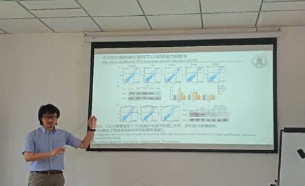 高坚教授以斑马鱼为研究对象,从研究背景、思路、内容以及成果等方面向大家详细介绍了延长酶1、延长酶3在不饱和脂肪酸合成中的重要作用。高教授分享的研究内容可以说是环环相扣,员工也是收获满满。分享结束后,在场师生就自己的兴趣和疑问之处与高教授进行了交流。